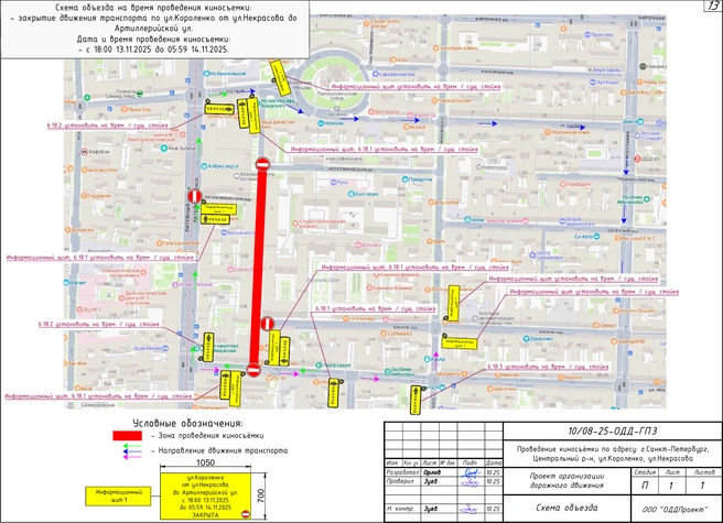 с 17:00 15 ноября до 04:59 16 ноября — перекресток набережной Макарова и съездов с Биржевого моста, перекресток Мытнинской набережной и площади Академика Лихачева, Мытнинская набережная от Зоологического переулка до Кронверкского проспекта, Зоологический переулок и площадь Академика Лихачева;