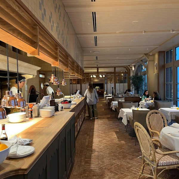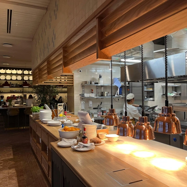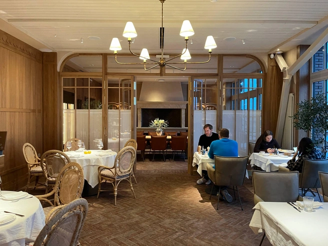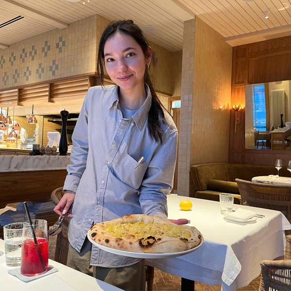 Внутри ресторан кажется бесконечно длинным: жаль, что хостес не предложили экскурсию. Посмотреть тут есть на что. Два главных системообразующих элемента интерьера: с одной стороны — открытая кухня, с другой — прозрачная стена из окон и дверей от пола до потолка. Если вы когда-то закажете здесь пиццу с собой, то на коробке увидите картинку, где солнце, паруса, мачты, зонтики и белые скатерти. В реальности за окном «Лодочной станции» был пейзаж из серии «Туман над Темзой»: огромная терраса сейчас абсолютно пуста, и, что самое обидное, ни одной лодки на горизонте, даже самой простенькой, рыбацкой.