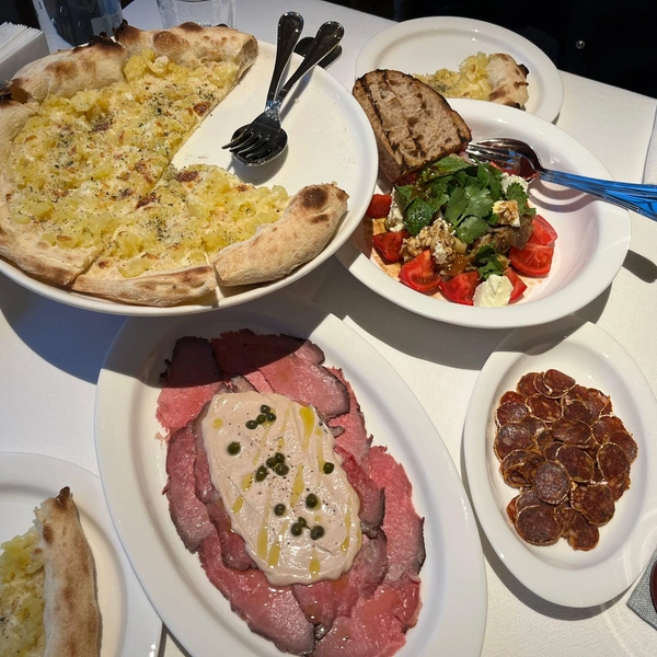 На быструю трапезу лучше не рассчитывать. Чтобы скрасить ожидание, приносят картофельные булочки со взбитым маслом. В разделе антипасти почему-то нет сыров, зато много всяческой колбасы — от мортаделлы (350) до салями с пармезаном и оливками (950). Говорят, все делают в стенах заведения. Под бокал вина можно смело брать, к примеру, чоризо (850), в меру пряная и острая.