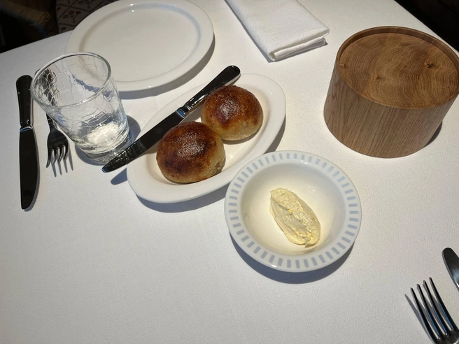 Десерты и булочки в меню на разных страницах, что неудобно, потому что стоит обратить внимание и туда, и туда. Впрочем, выпечка еще и выставлена на специальном столе рядом с баром. Шоколадный торт (750) — совершеннейшая классика, мечта сладкоежек, я бы бросил сверху еще несколько кристаллов соли. В качестве контрапункта.