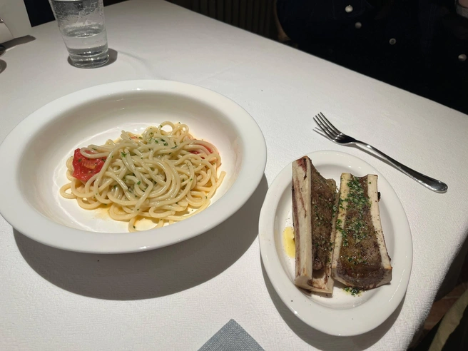 Самый большой раздел в меню — паста (850-2200), в нем около десятка позиций. И самая неожиданная из них — с костным мозгом (1300). Все виды пасты делают прямо в ресторане, спагетти получаются достаточно толстыми, почти как лапша для рамена. К столу отдельно приносят «макароны» и две половинки большой косточки, содержимое которых затем перекочевывает в основную тарелку. Конечно, это блюдо-эксперимент, притом эксперимент интересный, но точно не для всех. Очень советую подавать мозг еще более горячим, практически раскаленным.