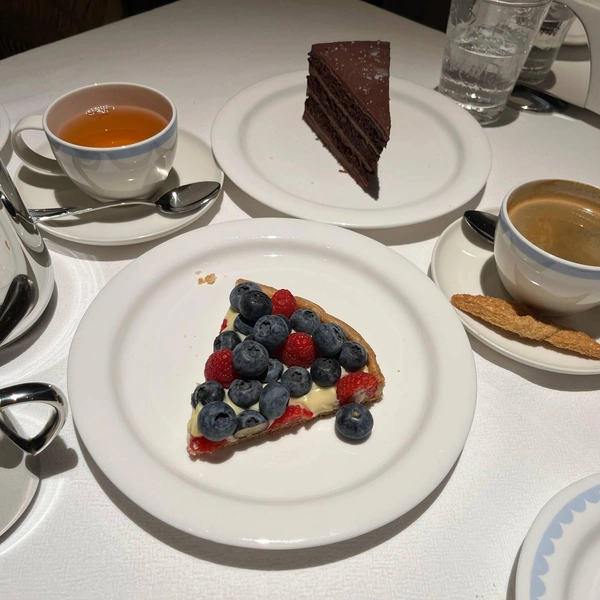 И, наконец, самый приятный сюрприз носил скромное имя «пирог дня». Кусок слоеного пирога с заварным кремом был чуть ли не в два слоя усыпан голубикой и малиной, ягоды даже сваливались на тарелку. При цене в 350 рублей с учетом всех остальных обстоятельств места и времени — это просто подарок.