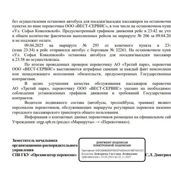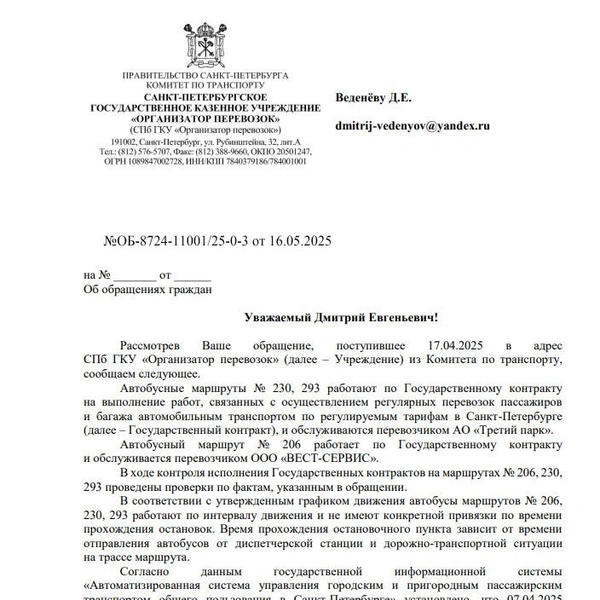 По словам Веденева, он написал порядка 10 жалоб, в ответах нарушение подтверждали. «Фонтанка» ознакомилась с несколькими. Речь идет о маршрутах 202, 206, 230, 293, 399. Действительно, классический ответ выглядит так: «07.04.2025 на маршруте № 230 от конечного пункта в рейс отправился автобус с бортовым № 35621 в 00:07 (план 00:05) и прибыл на начальный пункт в 00:45 (план 00:57) с опережением графика движения на 12 минут. Согласно треку движения автобуса с бортовым № 35621 зафиксирован факт проезда более 20% предусмотренных трассой маршрута остановочных пунктов без осуществления остановки автобуса для посадки/высадки пассажиров по вине перевозчика. Указанный рейс не учтен в общем количестве фактически выполненных рейсов на маршруте № 230 за 07.04.2025 и не подлежит оплате».
