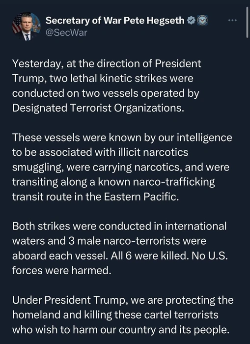 «Нашей разведке было известно, что эти суда связаны с незаконной контрабандой наркотиков, перевозят наркотики и следуют по известному маршруту транзита наркотиков в восточной части Тихого океана», — отметил Хегсет, заверив, что операция была проведена в международных водах.