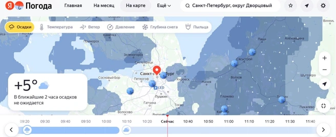 Осадки на карте «Яндекс.Погода» выглядят так.