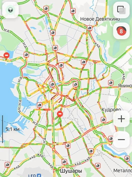 Согласно данным сервиса «Яндекс.Пробки», к 18:30 дорожная обстановка оценивалась на восемь баллов, это на два балла больше, чем обычно в это время в четверг. Ожидается, что в ближайший час заторы начнут снижаться, а к 22 часам и вовсе опустятся до 2 баллов.