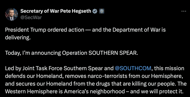 «Президент Трамп приказал действовать — и Военное министерство выполняет свой долг, — написал Хегсет. — Сегодня я объявляю об операции „ЮЖНОЕ КОПЬЕ“».
