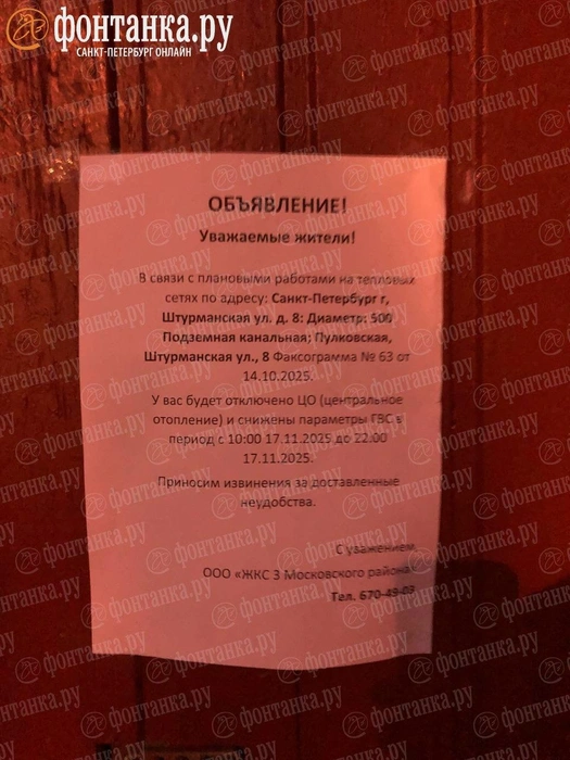 Он поделился фотографией объявления от «ЖКС 3 Московского района», в котором говорится, что в связи с плановыми работами на тепловых сетях по адресу: Штурманская улица, 8, будет отключено центральное отопление и «снижены параметры ГВС» с 10 часов 17 ноября до 22 часов 17 ноября. Однако тепла до сих пор нет.