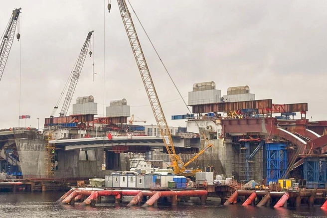 Строители, возводящие первый за 40 лет разводной мост в Петербурге, приступили к новому этапу работ. На переправе предстоит смонтировать разводной пролет.