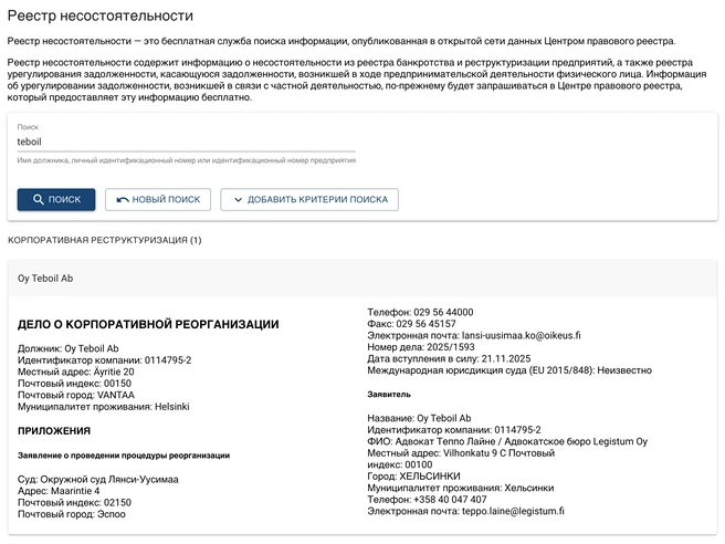 Финская компания Teboil (дочернее предприятие российской нефтяной компании ЛУКОЙЛ) подала заявление о корпоративной реструктуризации. Заявление Oy Teboil Ab в пятницу поступило в окружной суд Западного Уусимаа, согласно реестру дел о несостоятельности Министерства юстиции.