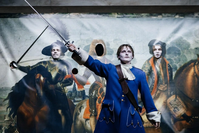 Актеры наряжены в мундиры ярких цветов. Принца в форме ярко-синего оттенка играет Михаил Гостев, актер с внешностью русского Иванушки из сказок, не желающего взрослеть баловня судьбы. Он существует в сонном блаженстве наяву и становится объектом шутки высокопоставленной компании во главе с курфюрстом, но ему, как и следовало ожидать, везет: сорвав, как ему кажется, во сне перчатку с руки племянницы курфюрстины, он обретает невесту, принцессу Наталью Оранскую (Татьяна Солошенко). Пасторально-танцевальное простодушие этих забав делает и героев похожими на фарфоровых куколок, тем более что лица их изрядно набелены. Вот только черные круги вокруг глаз слегка смущают.
