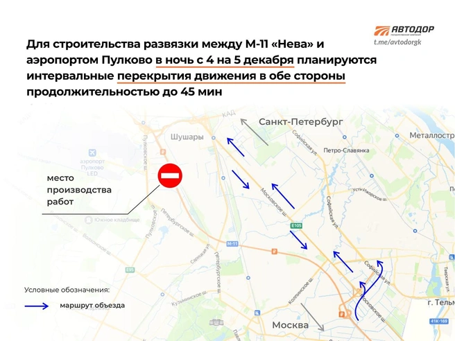Ограничения связаны со строительством развязки М-11 с подключением в аэропорту Пулково, которое продолжается в Петербурге. Водителей просят учитывать перекрытия при планировании поездки.