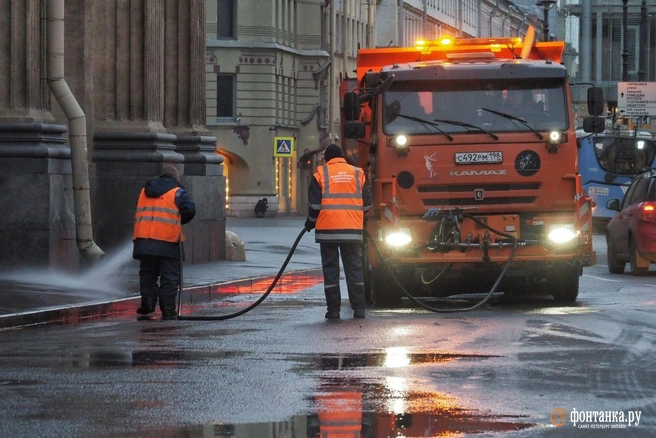 Пока погода позволяет, дорожники пользуются, вероятно, последней в этом году возможностью помыть город с водой. В центр города вывели технику с летним навесным оборудованием, чтобы смыть грязь, например, у главных достопримечательностей Петербурга.
