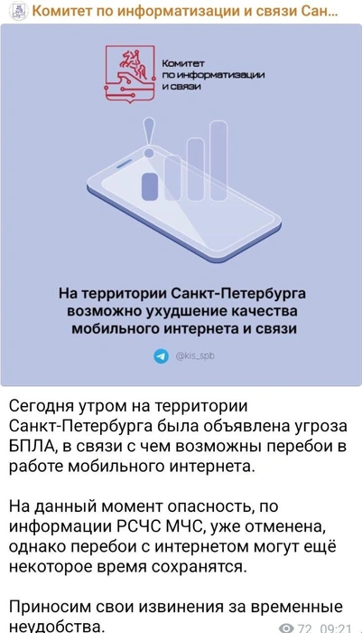 «Сегодня утром на территории Санкт-Петербурга была объявлена угроза БПЛА, в связи с чем возможны перебои в работе мобильного интернета», — говорится в сообщении.