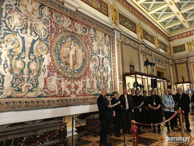 В эти дни в мойку направляется четвертая из шпалер (проект идет с 2023 года). Увидеть все шпалеры вместе можно будет в Манеже Малого Эрмитажа в июне 2026 года.