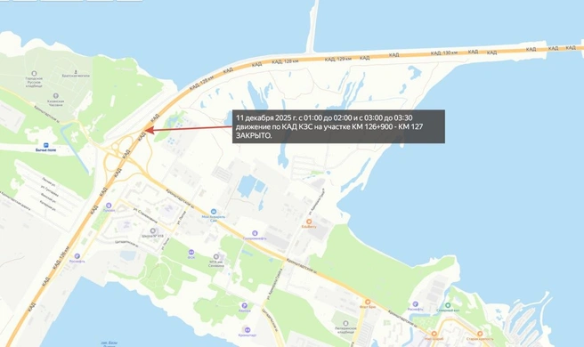 С 01:30 до 02:00 и с 03:00 до 03:30 11 декабря на участке КАД со 126-го по 127-й километр перекроют движение как по внутреннему, так и по внешнему кольцу, сообщает 9 декабря пресс-служба Дирекции КЗС Петербурга. Выезд из Кронштадта в сторону Ломоносова при этом будет осуществляться без ограничений.