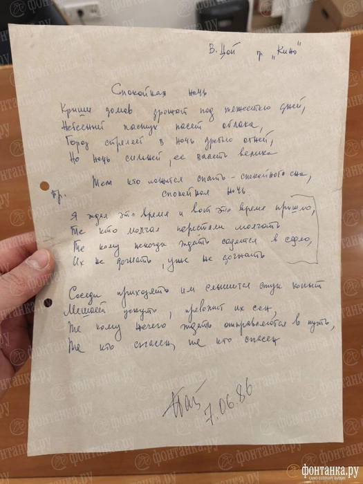 Рукопись песни «Спокойная ночь» Виктора Цоя продадут на аукционе в Санкт-Петербурге. Стартовая цена — 1 млн рублей. Об этом стало известно во вторник, 9 декабря, из сообщения аукционного дома «Литфонд».