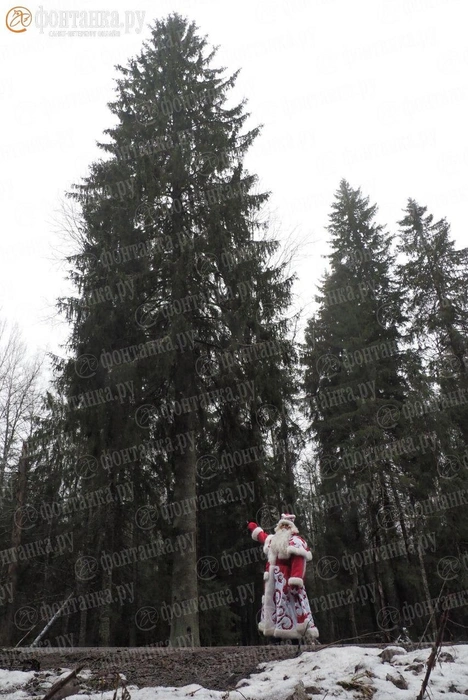 В кадр попала 30-метровая ёлка, на пышное дерево показывает стоящий рядом Дед Мороз. По данным «Фонтанки», обхват кроны достигает 4,8 метра. Весит ёлка больше 10 тонн.