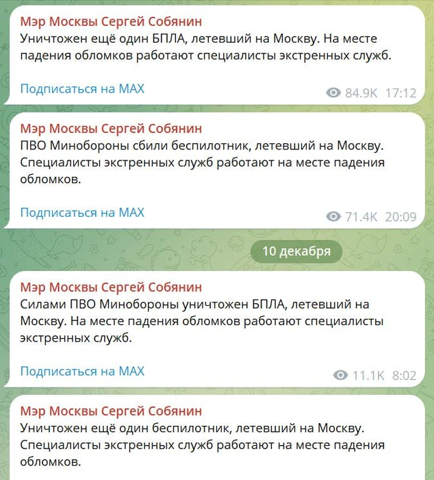 Утром 10 декабря атака дронов на Москву продолжается. Столичный мэр Сергей Собянин в 8:02 сообщил о перехвате одного беспилотника, летевшего на Москву, а в 8:16 — второго.