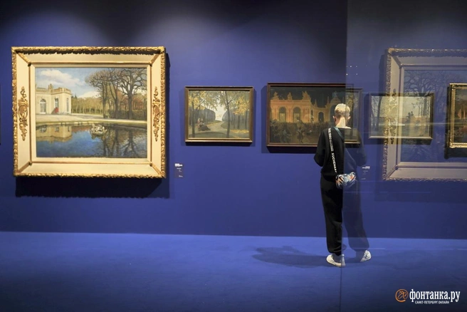 Тут же на втором этаже — работы Бенуа из серии посвящённых Версалю (рубеж XIX–XX веков). Его Версаль (особенно зимний) будто сращен с Петергофом, да и вообще образы Бенуа настолько синтетичные, что вычленять из них «натуру» совершенно не хочется. Этот хрупкий мираж держится только на силе воображения.