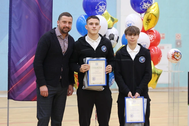 Слева направо: руководитель ФК «Алмаз — Антей» Максим Крычанов; лучшие игроки молодежной команды Артем Ананьин и Никита Воронин