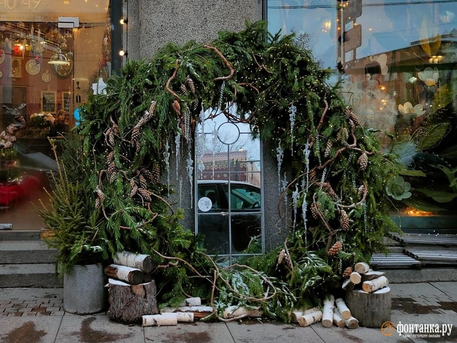 В SMStudio на Литейном поставили праздничное украшение из листьев и подарочных коробок в два горшка, но, переплетаясь, ветви создают над входом арку. Арочную конструкцию с елочными шарами и плодами граната выбрала и «Мама Тата» на Большом проспекте Петроградской стороны.