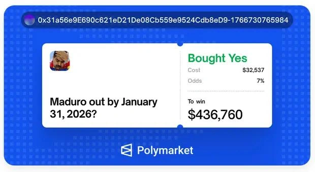 Ставки на Polymarket на то, что Мадуро лишится власти до конца января, выросли за несколько часов до того, как президент США Дональд Трамп в субботу объявил о захвате венесуэльского лидера. Один из пользователей, зарегистрировавшийся на платформе в прошлом месяце и открывший четыре позиции, все по Венесуэле, заработал более 436 000 долларов (322 000 фунтов стерлингов) при ставке в 32 537 долларов.