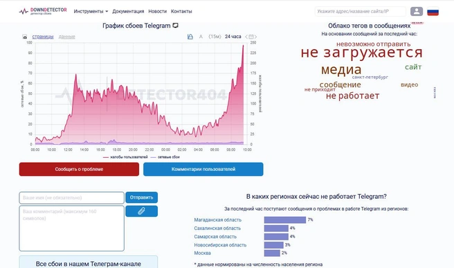Жалоб много: более 700 за час и более 8,3 тысячи за сутки. Больше всего жалоб поступило из Магаданской, Сахалинской, Самарской, Новосибирской областей и Москвы, есть и из Петербурга. «Не грузится вообще ничего, ни с мобильным, ни с вайфаем. Про медиа молчу, второй день не отправляются, не загружаются», — пишут на сайте. Медленная загрузка медиа — основная претензия. Кто-то не может отправить не только фото, но и сообщение.