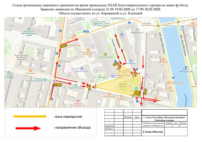 Как сообщили 12 февраля в пресс-службе комитета по транспорту Петербурга, с 21:00 19 февраля до 17:00 20 февраля будет перекрыто движение транспорта на Манежной площади и Кленовой улице вдоль дома 4.