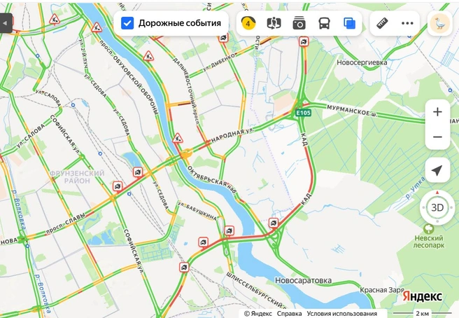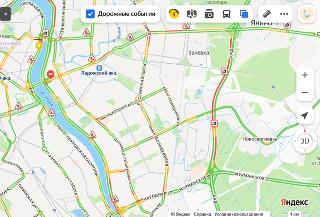 Сейчас пробка там почти рассосалась. Но более длинная пробка стоит на внутреннем кольце дальше, в районе вантового моста.