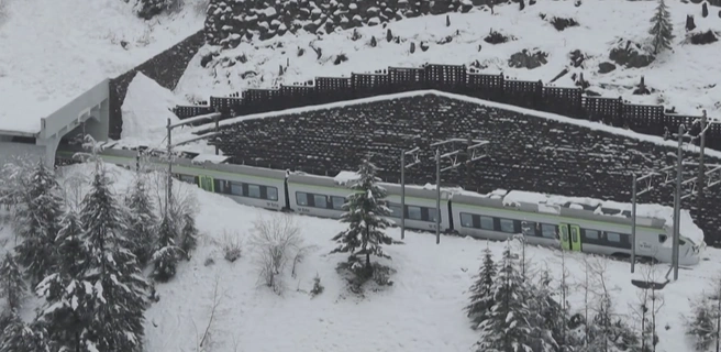 Поезд влетел в оказавшийся на путях снег сразу после выхода из туннеля. Один из пострадавших был доставлен в больницу, четырем остальным помощь была оказана на месте.