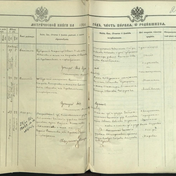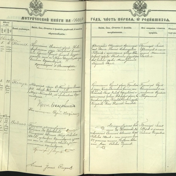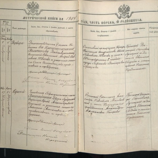 Павел Иванович натирал полы и встречал императора в ложе Мариинского театра, его дети служили чиновниками в Кабинете Его Императорского Величества. При том, что наибольшего чиновничьего статуса в имперской России достиг Андрей, интересно то, кем был Михаил. В метрических книгах домовой церкви Александра Невского при Аничковом дворце я нашел три записи о рождении детей Михаила: Марии (1887), Надежды (1889) и Анатолия (1895). У всех детей восприемницей была французская гражданка София (Жозефина) Викторовна Дабоно. Крестным отцом Марии был брат Михаила — Андрей, другой брат, Виктор, был крестным у Надежды. Интересно то, какую должность занимал Михаил в 1887 году: «Кабинета Его Величества Журналист». Но еще интереснее то, кто был восприемником у Анатолия в 1895 году: «Заочно изволит быть Его Императорское Величество Государь Император Николай Александрович, а при купели находились: Большого Собора Императорского Зимнего Дворца протодиакон Матфий Васильев Ильинский и Французская гражданка София (Жозефина) Викторова Дабоно».