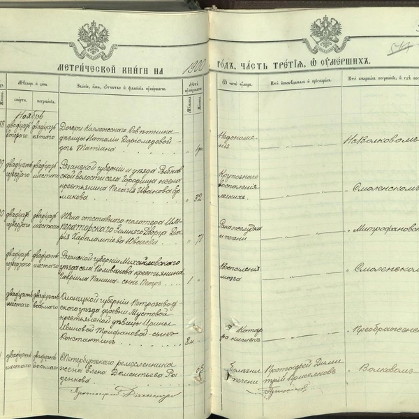 Жена отставного полотера Императорского Зимнего дворца Дария Харлампиевна Ювачева умерла 24 ноября 1900 года и похоронена на Митрофаньевском кладбище 26 ноября. ЦГИА СПб. Фонд 19. Опись 127. Дело 1003. Листы 594об-595.