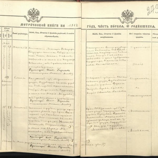 Наталия родилась 12 мая 1912 года и была крещена 19 мая. Восприемники — дядя Петр Павлович и тетя Наталия Ивановна Колюбакина. ЦГИА СПб. Фонд 19. Опись 127. Дело 2728. Листы 278об и 279.