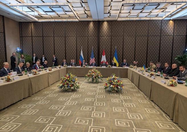 Украинскую делегацию возглавил секретарь Совета национальной безопасности и обороны Украины Рустем Умеров, делегацию России — помощник президента РФ Владимир Мединский. Российская делегация насчитывала не менее 15 человек. Кроме Мединского в нее вошел заместитель министра иностранных дел России Михаил Галузин. Также в Швейцарию прибыл спецпредставитель президента Кирилл Дмитриев, он будет работать по отдельному треку в рамках экономических отношений между РФ и США. От Соединенных Штатов в переговорах примут участие спецпосланник президента Стив Уиткофф и зять Трампа Джаред Кушнер.
