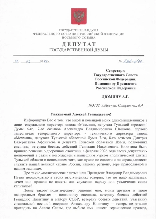 В том же письме он написал, что вместе с ним свои депутатские полномочия хотят сложить его соратники из Заксобрания Тульской области и тульской гордумы: гендиректор завода «Мехмаш» Александр Швыков, его первый заместитель на предприятии Дмитрий Афоничев и полковник спецназа Геннадий Никитин.