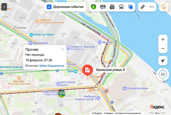 Крупный пожар тушат утром 18 февраля в Василеостровском районе Петербурга. Движение в районе съезда с моста Бетанкура на остров Декабристов затруднено.