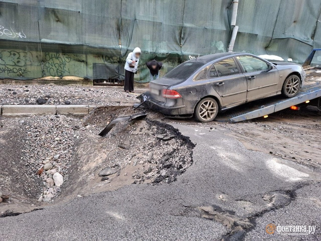 Последствия коммунальной аварии продолжают устранять в Центральном районе Петербурга 21 февраля. Из пострадавших — асфальт и легковой автомобиль, который пришлось доставать из ямы.