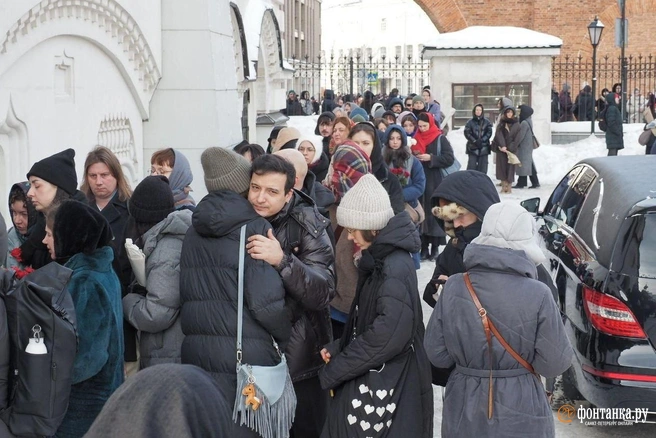 Сотни людей собрались утром 24 февраля в Петербурге у храма Феодоровской иконы Божией Матери, где сегодня прощаются с музыкантом Николаем Комягиным.