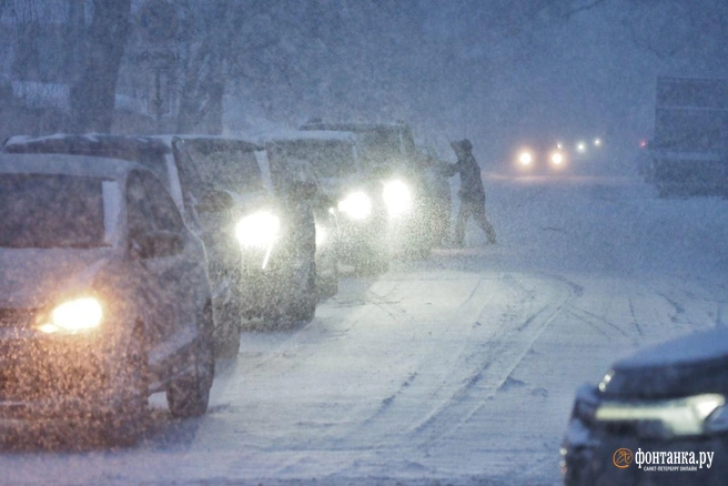 Петербург вечером 26 февраля накрыла обещанная непогода. В городе все еще сохраняются пробки, горожане пытаются пробраться домой, а пассажиры ждут своих рейсов в аэропорту.