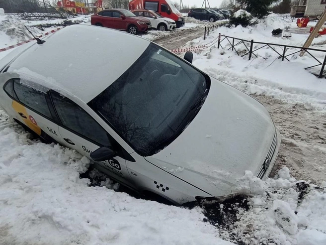Днем 27 февраля в Красном Селе такси частично угодило в яму. Произошло это после того, как на Геологической улице размыло грунт.