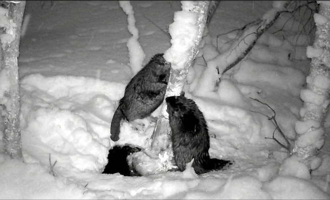 На записи видно — и слышно, — как самец и самка дружно пытаются перепилить дерево возле полыньи. Основной едой бобров зимой являются ветки, и чтобы до них добраться, животные валят деревья. Немаловажную роль в этом процессе играет хвост: бобры используют его как третью точку опоры для большей устойчивости.
