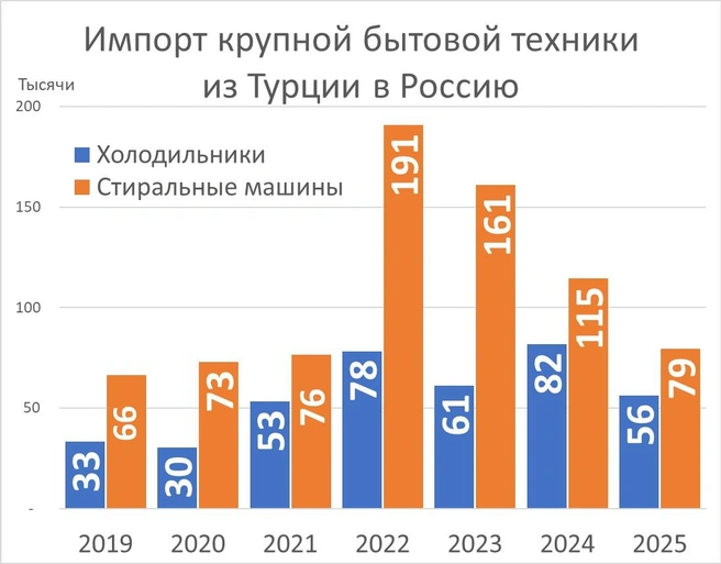 По данным китайского таможенного ведомства, начиная с 2022 года поставки крупной бытовой техники из Китая в Россию уверенно растут, хотя в 2024-25 годах оставались примерно на одном уровне.
