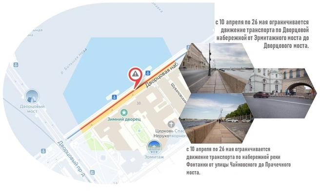 Первый этап ограничений на Дворцовой набережной и набережной Фонтанки стартует 10 апреля и продлится до 26 мая