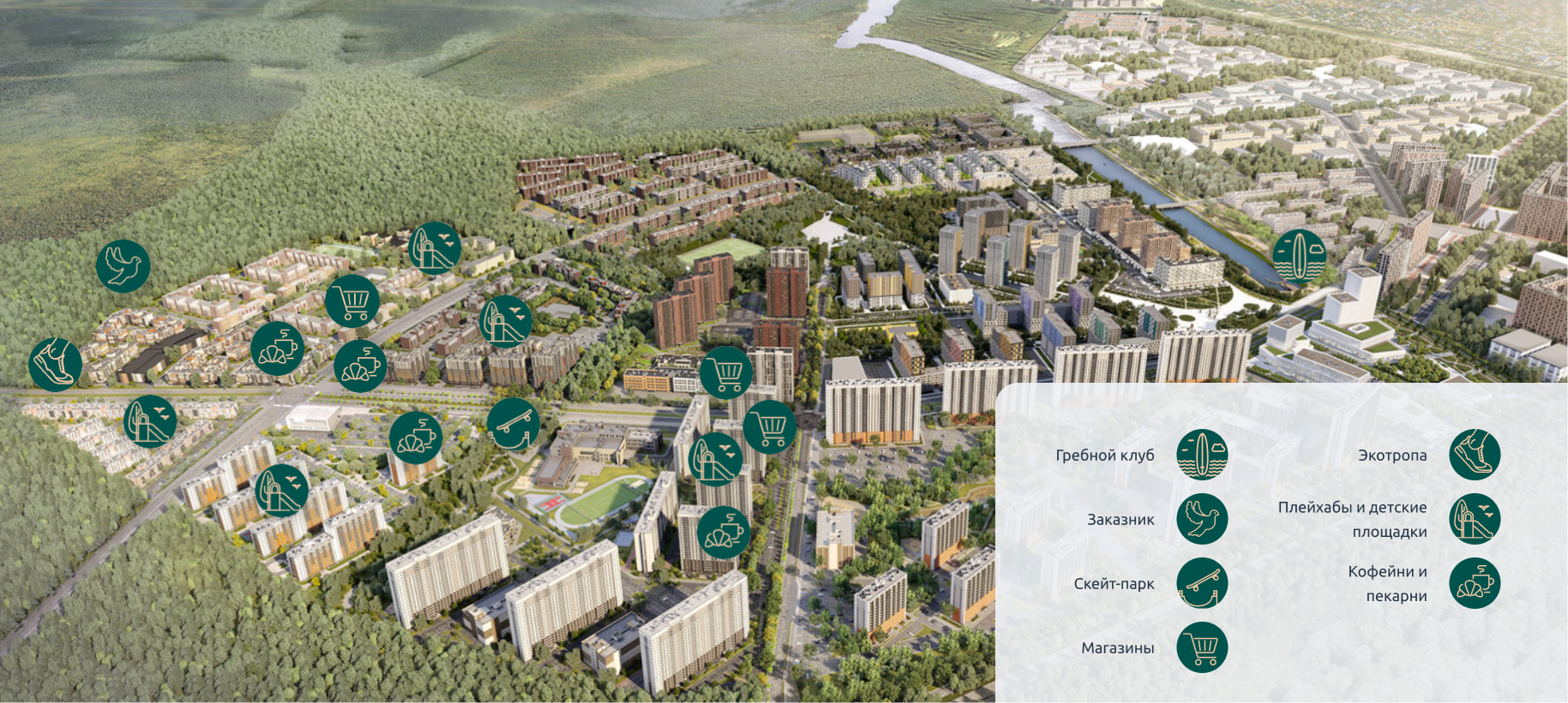 Чем девелопер планирует наполнить это пространство? Там появится центральная площадь для мероприятий, маршруты для неторопливых прогулок, пешеходная зона, удобная для мам с колясками. И, конечно, различные спортивные зоны — воркаут, велодорожки, футбольный стадион без трибун.