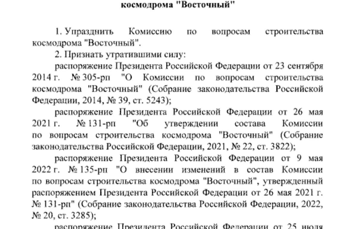 Путин упразднил комиссию по вопросам строительства космодрома Восточный