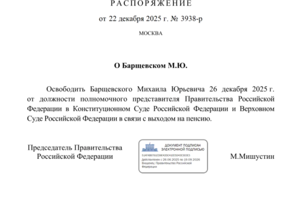 Мишустин освободил Барщевского от должности полпреда правительства в Конституционном суде