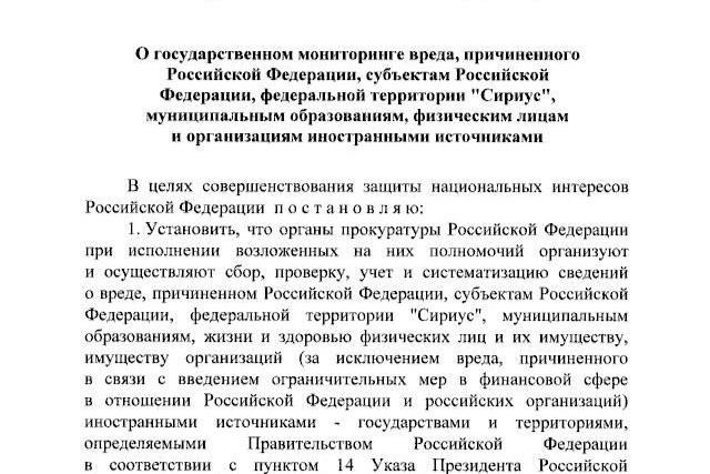 Путин поручил прокуратуре собрать сведения о вреде, причиненном РФ другими странами и иностранными организациями