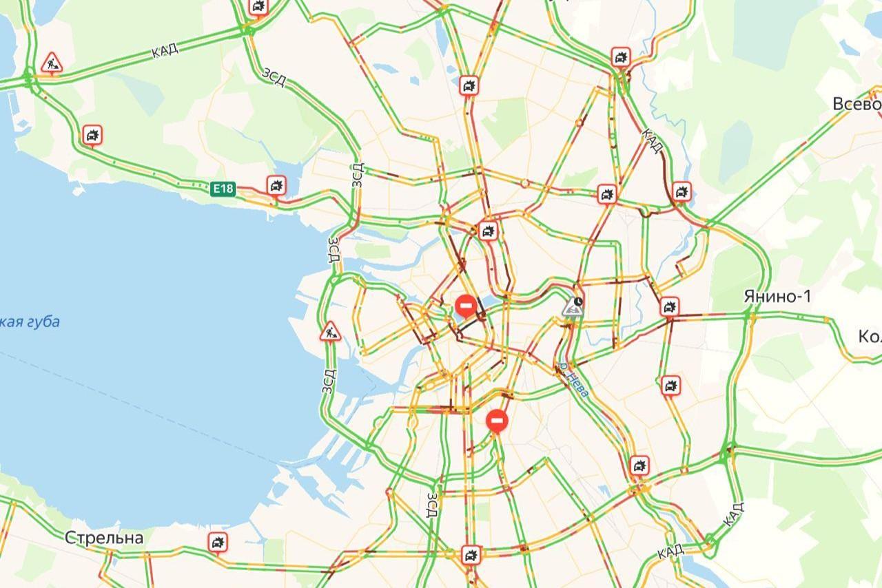В вечерний час пик Петербург светится «красным». В городе семибалльные пробки
