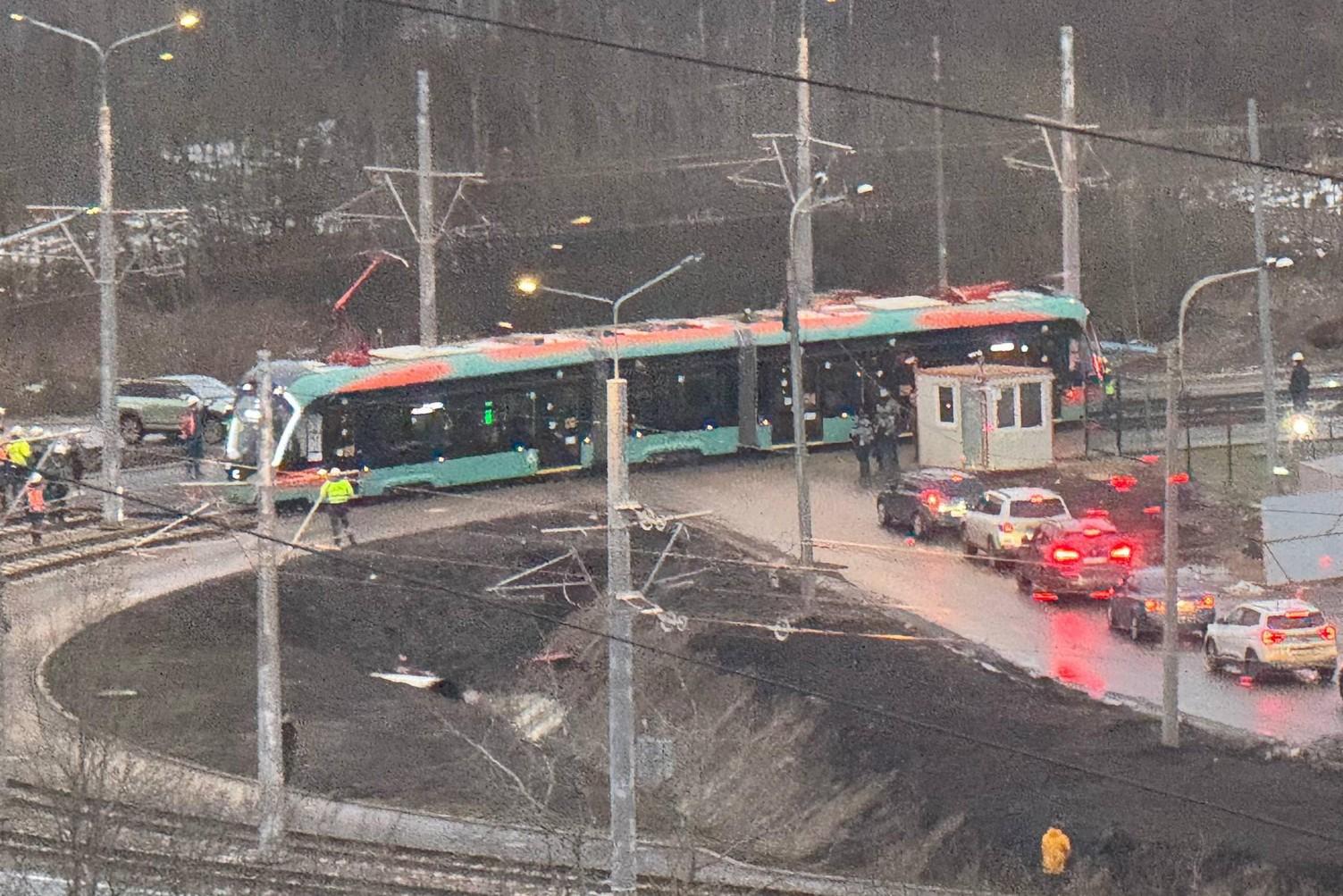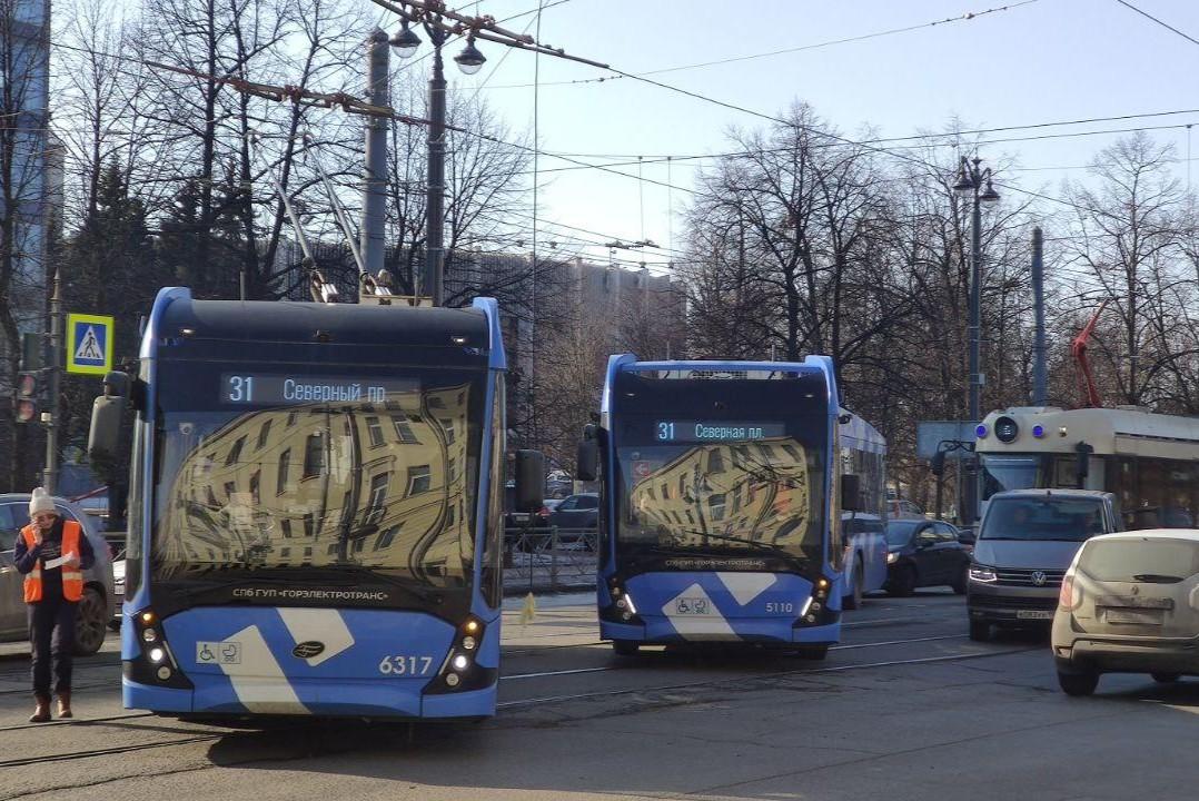 Свисающие до земли провода собирают пробку на ДобролюбоваНа перекрестке в Петербурге оборвали контактную сеть